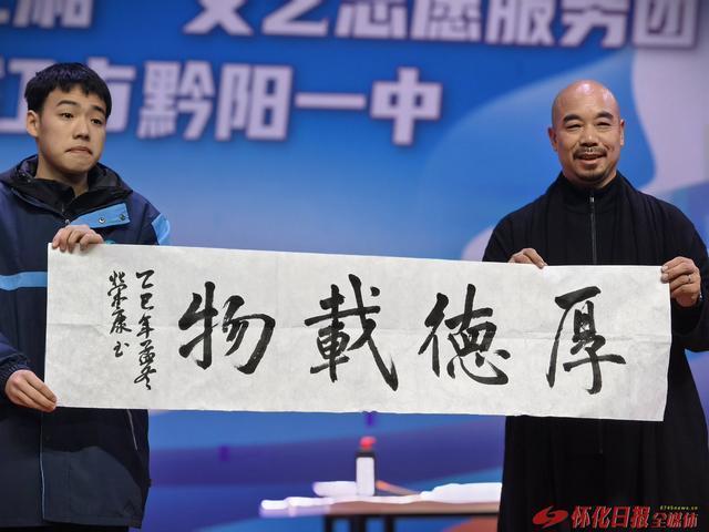 演出由旋律昂扬的《我们的新时代》拉开序幕;黔阳一中学生带来的街舞《幻想童话2.0》活力四射,展现了青春风采;湖南省书法家协会副主席、秘书长胡紫桂与学生黄榮康联袂呈现的书法展示,在悠扬伴奏中实现了艺术传承;魔术师黄亮《万剑穿心》以神奇的“六连环”开场,将科技与艺术巧妙融合,鼓励孩子们探索未知奥秘。朗诵《开花》、歌曲《边境的小鸟》《如愿》《光亮》、舞蹈《繁花》、杂技《云上白羽》依次精彩亮相。节目的最后由黔阳一中全体高三教师饱含深情合唱《水手》《骄傲的少年》,歌声中充满奋进力量,激励在场即将迈向高考战场的高三学子勇往直前,攻坚克难、夺取胜利。